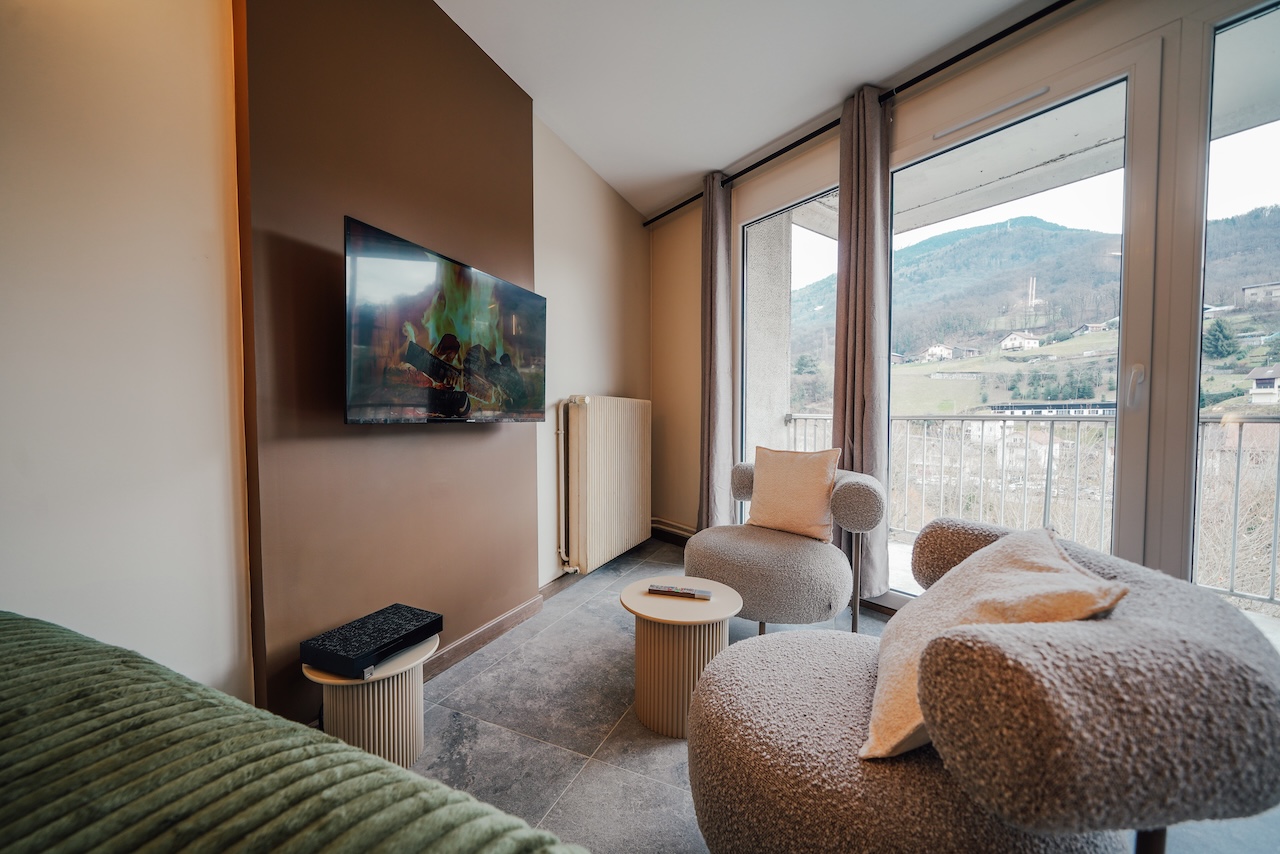 Entièrement rénové, il dispose d’un lit double (140x200), d’un espace salon avec TV, d’un coin bureau, d’un balcon avec espace repas et d’une vue dégagée. La cuisine est entièrement équipée (four, micro-ondes, plaques à induction, réfrigérateur). Le logement comprend également un lave-linge et une salle d’eau avec douche et WC.